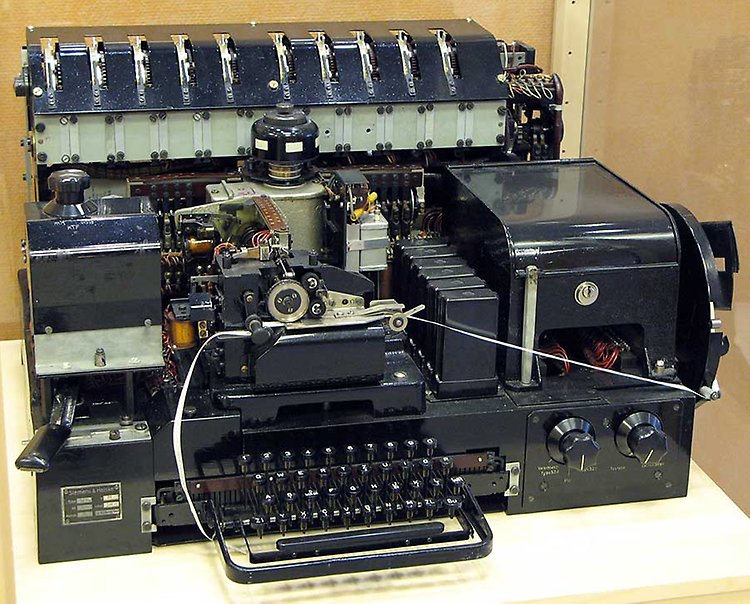 G-skrivare i FRA:s museum. Maskinen på bilden har huven avtagen för att man ska se innanmätet. Normalt hade maskinen en svart huv. Denna maskin kom till FRA efter kriget.